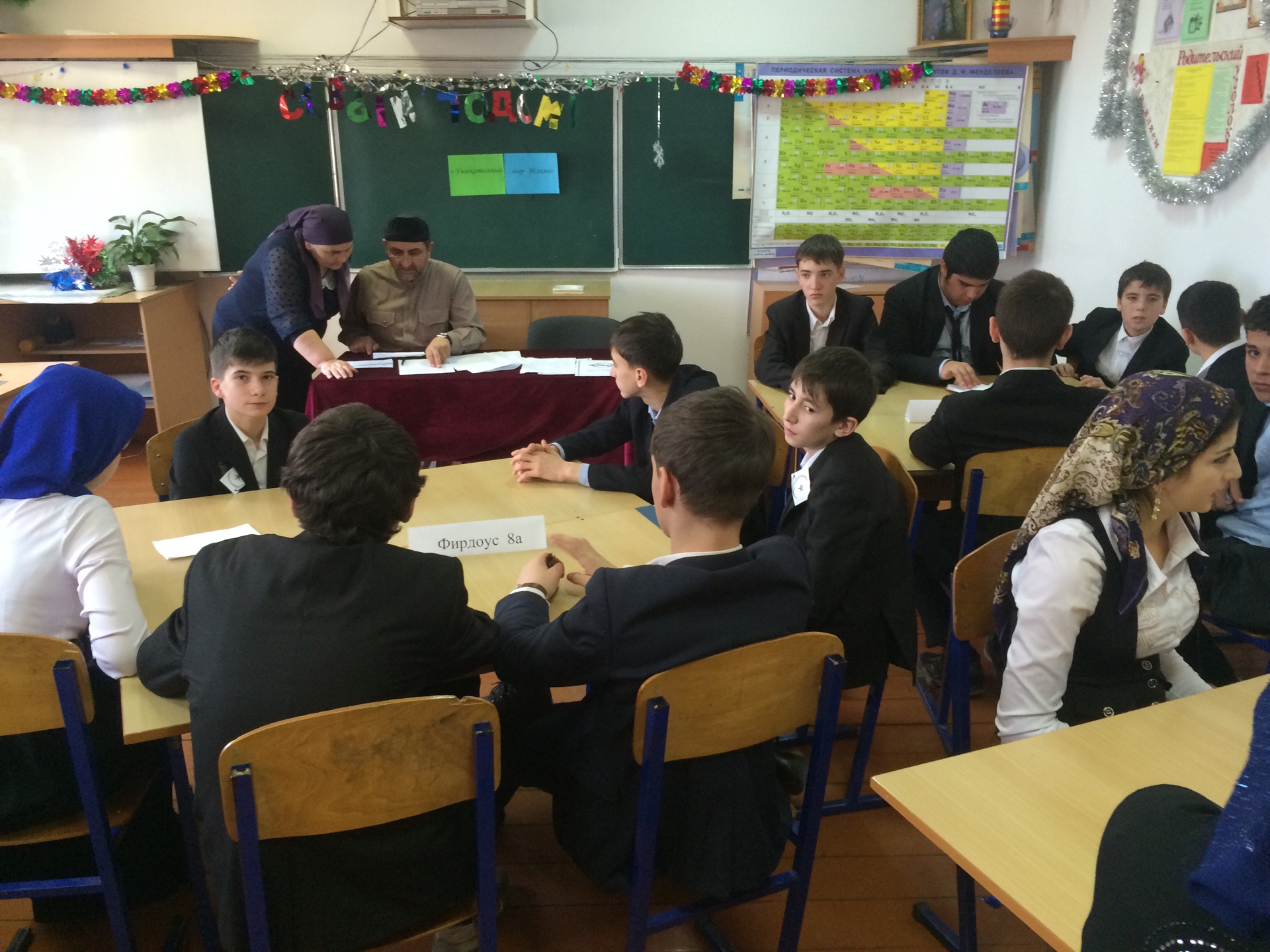 1-й конкурс состоял из блиц вопросов. Каждой из 4-х команд были заданы по 5 вопросов легкого уровня по очереди. За каждый правильный ответ команда получала 1 балл.2-й конкурс-Узнать личность по краткому описанию.Организатор по ДНВ Асаев М.И. зачитывал краткую информацию про личности Ислама, команды отгадывали. За правильный ответ команды получали 3 балла.3-й конкурс : Вопросы капитанам команд. Капитаны по одному выходили, вытягивали листочек с вопросом повышенной сложности и отвечали. За правильный ответ капитаны получали 5 баллов4-й конкурс : Арабское письмо. Всем командам были даны 10 мусульманских имен написанных на чеченском языке, а игроки их писали на арабском языке.5-й конкурс: Домашнее задание.Игроки на суд жюри представили сочинения : «Пагубное влияние терроризма».Лучшими признаны сочинения команд «Жовхар» и « Барт».По итогам всех проведенных конкурсов первое место заняла команда «Жовхар».Активное участие в проведении игры принял лидер школьного ДЮД Шамсуев Муса.Игра имеет большое воспитательное значение .