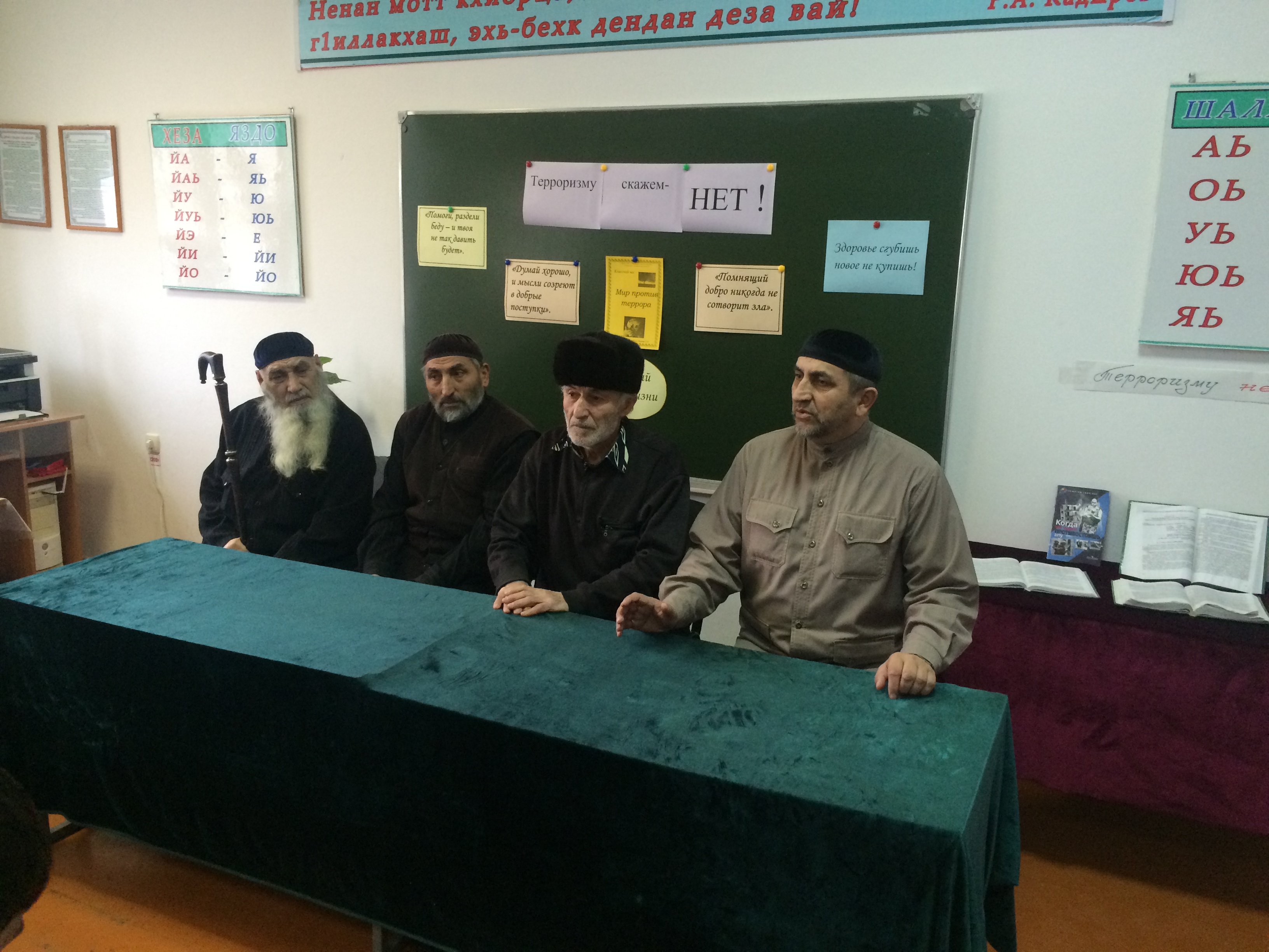 Целью мероприятия было сформулировать у учащихся представление о терроризме как историческом и политическом явлении; акцентировать внимание необходимости проявления бдительности. Организатором круглого стола был педагог – организатор по ДНВ Асаев Магомед Ибрагимович. В качестве почетных гостей на данное мероприятие были приглашены: председатель Совета старейшин и общественного совета поселка Ойсхара Мудаев У., член совета старейшин Цагаев М-Яраг1и – хьаьжи, туркх поселка Ойсхара Асаев Али Ибрагимович. С приветственным словом выступил организатор круглого стола Асаев Магомед Ибрагимович, который сообщил тему и задачи круглого стола. Далее слово было предоставлено представителям духовенства. В ходе мероприятия они провели беседу, были затронуты актуальные вопросы : присутствующие говорили о страшном явлении терроризма, о вредном влиянии телефонов и интернета на молодежь. Кульминацией мероприятия стала пресс-конференция, где школьники задавали гостям интересующие их вопросы. Представители духовенства охотно, приводя реальные примеры, отвечали на их вопросы. В конце уважаемые гости призвали ребят к учебе, т.к. только образованный человек сможет противостоять ненужным влияниям и определить правильный путь в своей жизни. «Данное мероприятие является неким связующим между нами и молодежью. Вы наше будущее, то какими вы будете среди слоев общества, зависит от вас. Вы постоянно находитесь среди огромного количества разных людей, ваши одноклассники, друзья, сестры, братья, возможно, они, запутавшись в правильности выбранного пути, ждут от вас помощи и поддержки. Будьте внимательнее по отношению к окружающим вас людям»,- обратился к учащимся член совета старейшин Цагаев М-Яраг1и. Председатель совета старейшин Мудаев У. добавил: «Духовность тесно связана с национальной идеей процветания и защиты современной Чечни, без неё невозможно добиться серьезного результата ни в политике, ни в экономике, ни в системе образования». По окончании круглого стола участники и приглашенные выразили благодарность директору школы Талхиковой Санет Билаловне, а она ещё раз призвала молодежь, чтобы она проявляла бдительность и содействовала формированию толерантности к жертвам терактов.