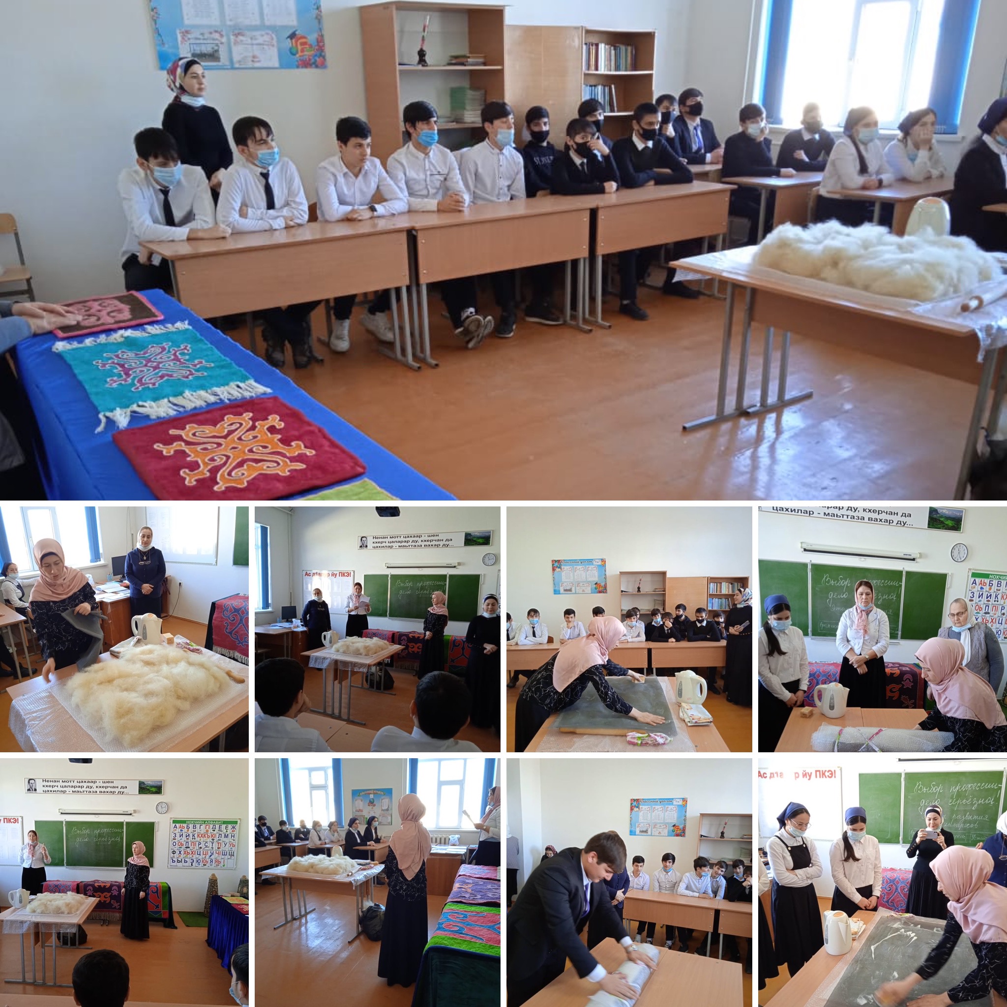 Мероприятие по профориентации "Мастер - класс по войлочному ковроделию - истангам". Проводили мастер - класс преподаватели ДХШ имени А.А. Ильясова Абдулхамидова М.Б. и Мацаева Р.А.