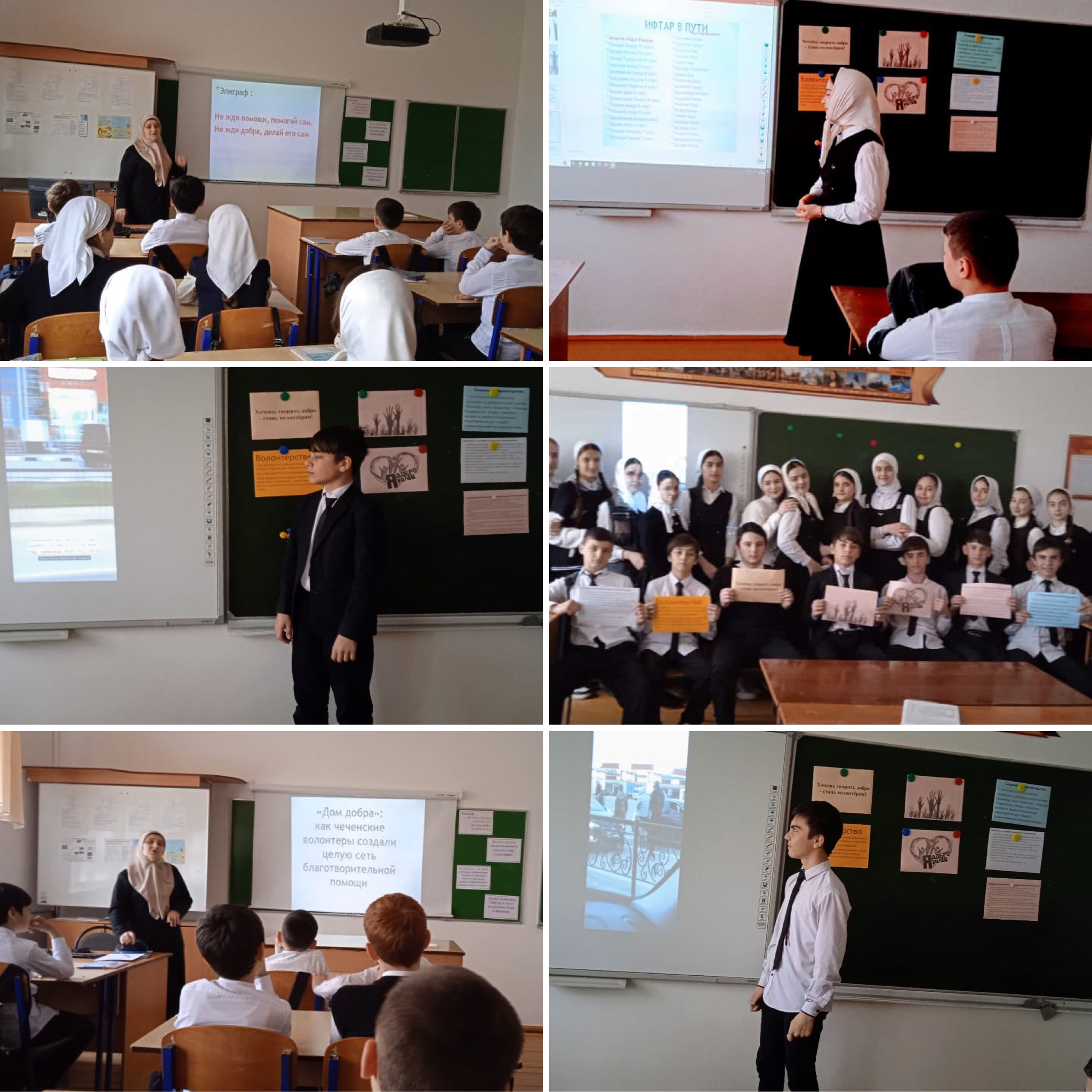 В конце урока посмотрели видеоролик о добровольческой деятельности детей и молодежи п. Ойсхара. В видеоролике учащиеся узнали себя и своих односельчан которые принимают участие в добровольческой акции в месяц Рамадан «Ифтар в пути». Эту акцию в нашем поселке проводят каждый год и учащиеся школы, и выпускники принимают в ней активное участие.