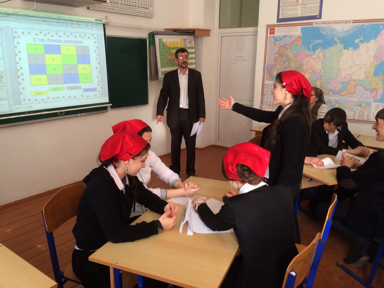 14.03.2015Интерактивную игру в 10-11 классах провели Турлаев А.А. и Эскербиева З.М. Учащиеся разделены на 4 команды: «Физики», «Химики», «Биологи» и «Географы».Интересный и своеобразный конкурс способствовал развитию познавательного интереса к химии, биологии, географии и физики. Развивались навыки работы в коллективе. Мероприятие продумано, грамотно спланировано. Прошло интересно, занимательно, познавательно. Задания разнообразны, размешались на слайдах. Обучающиеся продемонстрировали хорошие знания. Самыми интересными для детей были задания из «Черного ящика». Отгадывая задания, в качестве приза они получали содержимое ящика. В игре со зрителями победил ученик 11 кл. Зубайраев Али. Победили «Химики». Лучшим игроком был признан ученик 11 класс Эскербиев Магомед. Атмосфера на мероприятии дружелюбная, доброжелательная. В мероприятии приняли участие все учащиеся 10-11 классов.