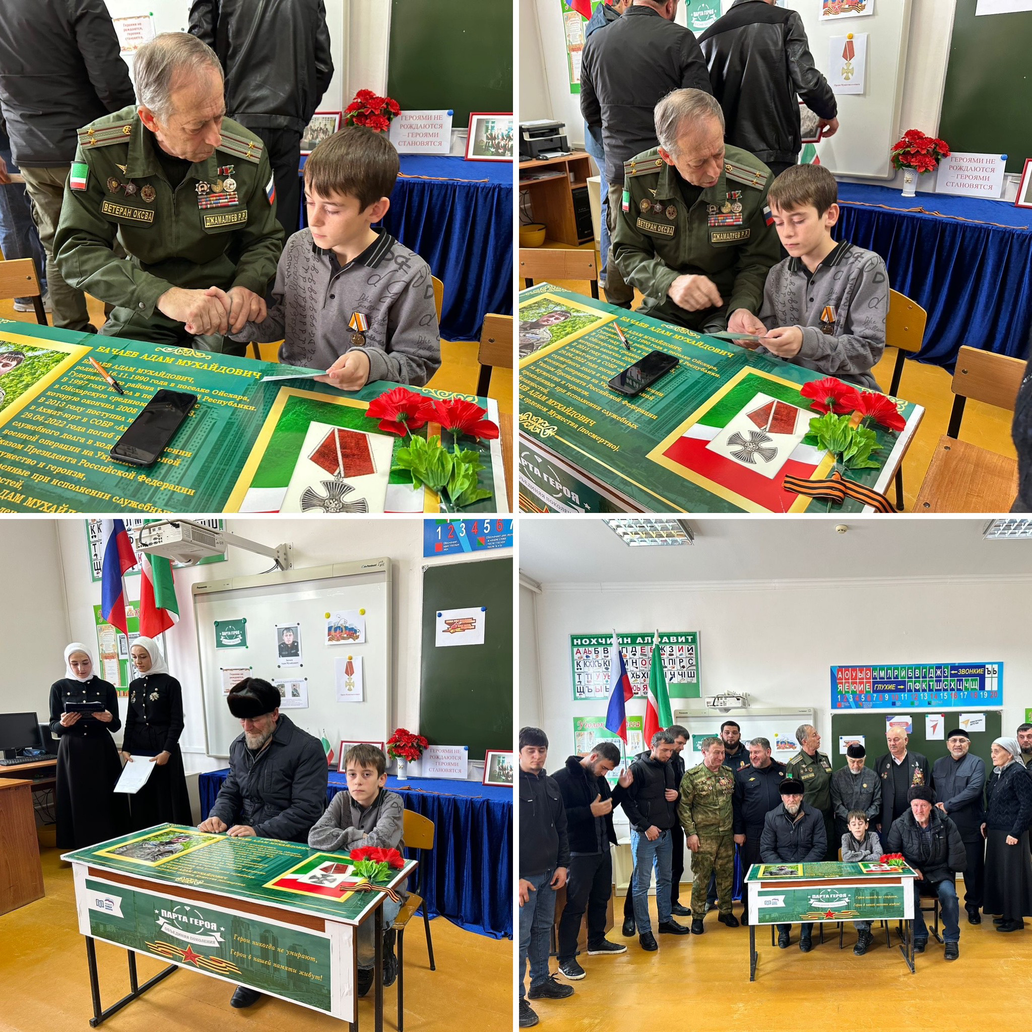 Далее состоялось торжественное открытие Парты героя. Она была оформлена фотографиями Адама Бачаева, информацией о нем. Парту украсили также цветы и символы патриотизма.