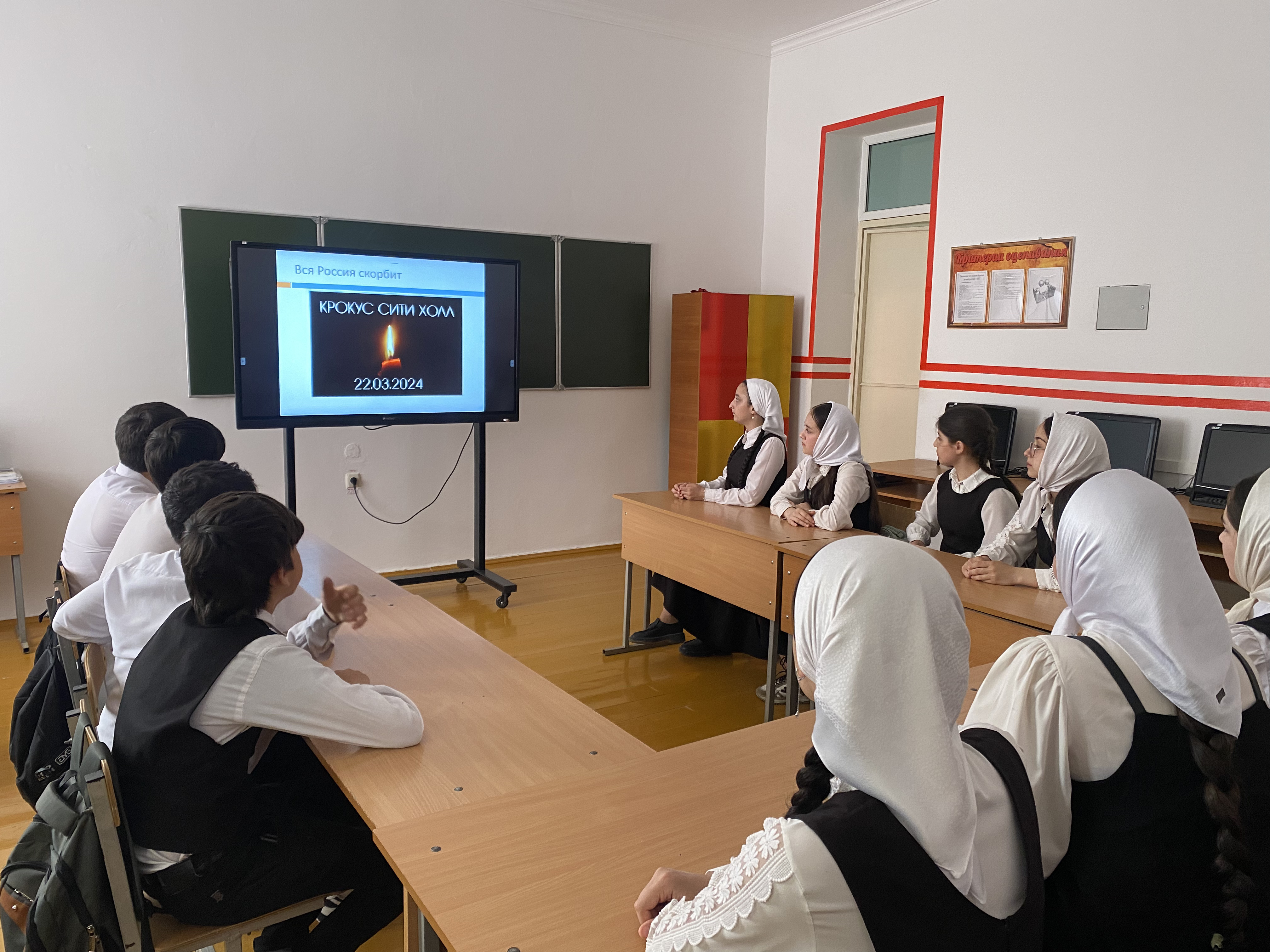 В МБОУ "Ойсхарская СШ3" во взаимодействии с отделом в Гудермесском районе УФСБ России по Чеченской Республике, прошел урок посвященный памяти жертв чудовищного теракта в "Крокус сити холл". Говорили о том, как работали в эти дни волонтеры, помогали пострадавшим: таксисты вывозили пострадавших бесплатно, более 3 тыс. доноров сдали кровь, москвичи привозили одежду и еду. Героические поступки совершали простые люди. Мальчик-киргиз, работавший в гардеробе, вывел из здания более 100 человек. И таких людей, идущих на риск ради спасения других, было немало.События в Крокус Сити — наша общая боль. Выражаем глубокие соболезнования всем пострадавшим