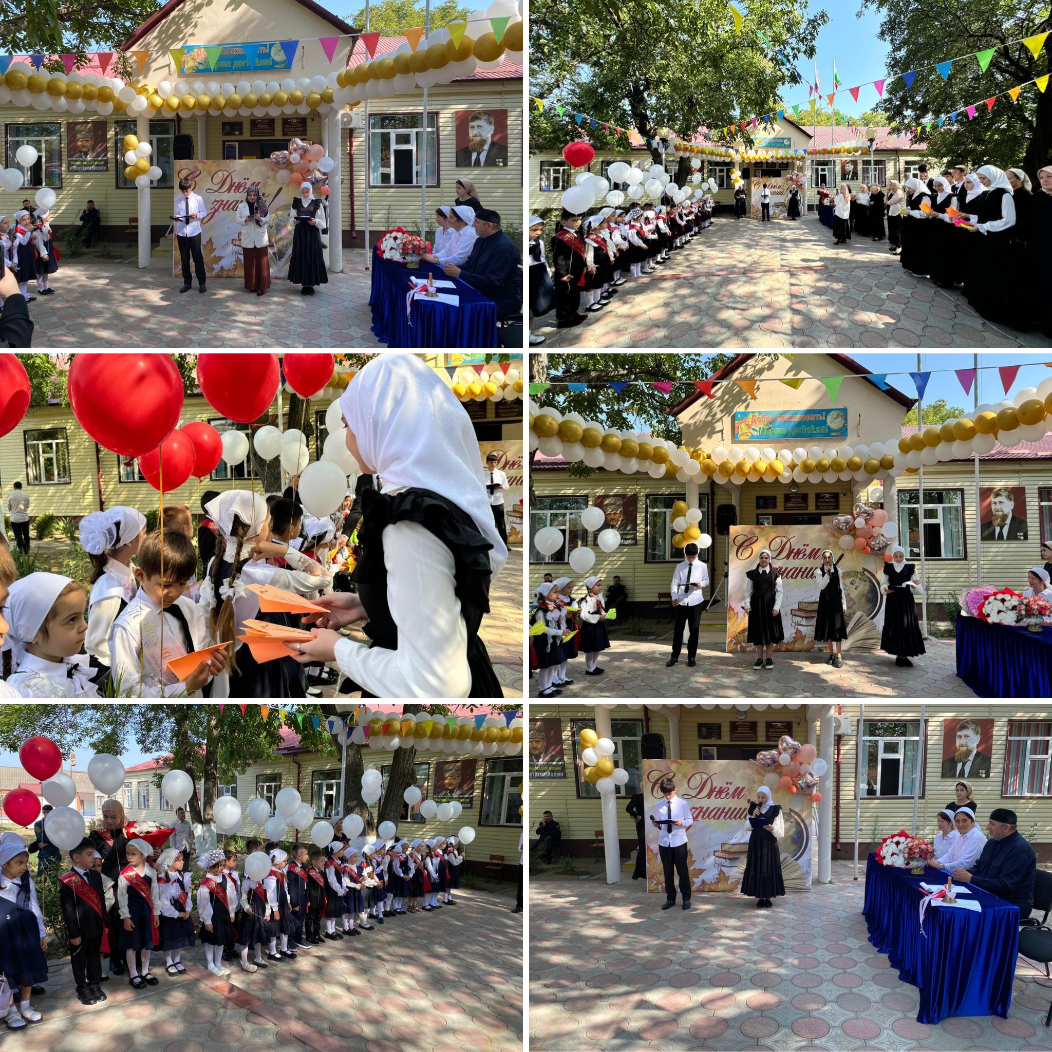Линейка началась с живой музыки, после чего ведущие, ученики 9 класса, Ибрагимова Сумия и Арсханов Ахьяд пригласили на мероприятие первоклассников с их классными руководителями Ахмедовой М.А. и Занаевой М.С.