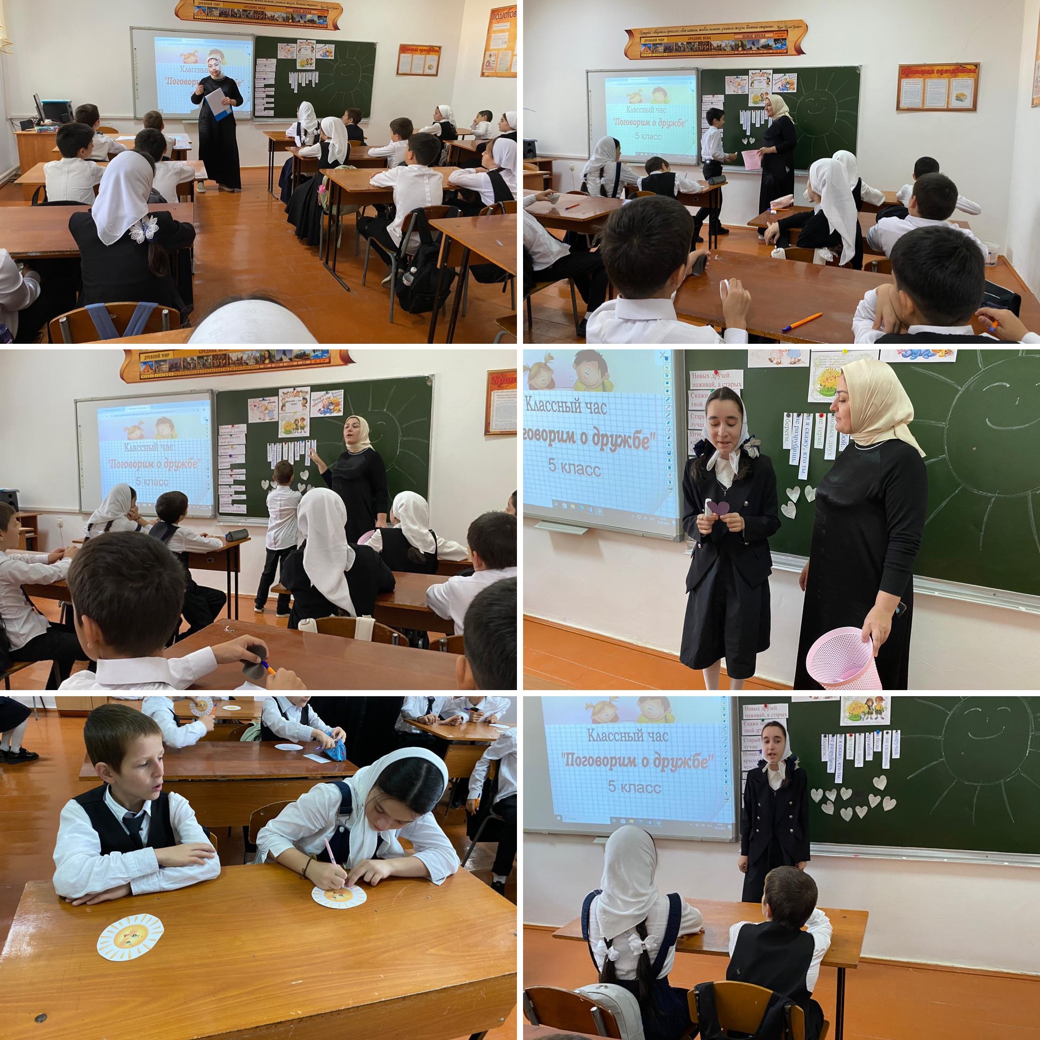 11 октября 2024 года в 5 «А» классе МБОУ «Ойсхарская СШ №3» прошёл открытый классный час" Поговорим о дружбе", целью которой являлось раскрыть сущность понятия "Дружба", показать какими качествами должен обладать настоящий друг, какую роль играют друзья в нашей жизни.