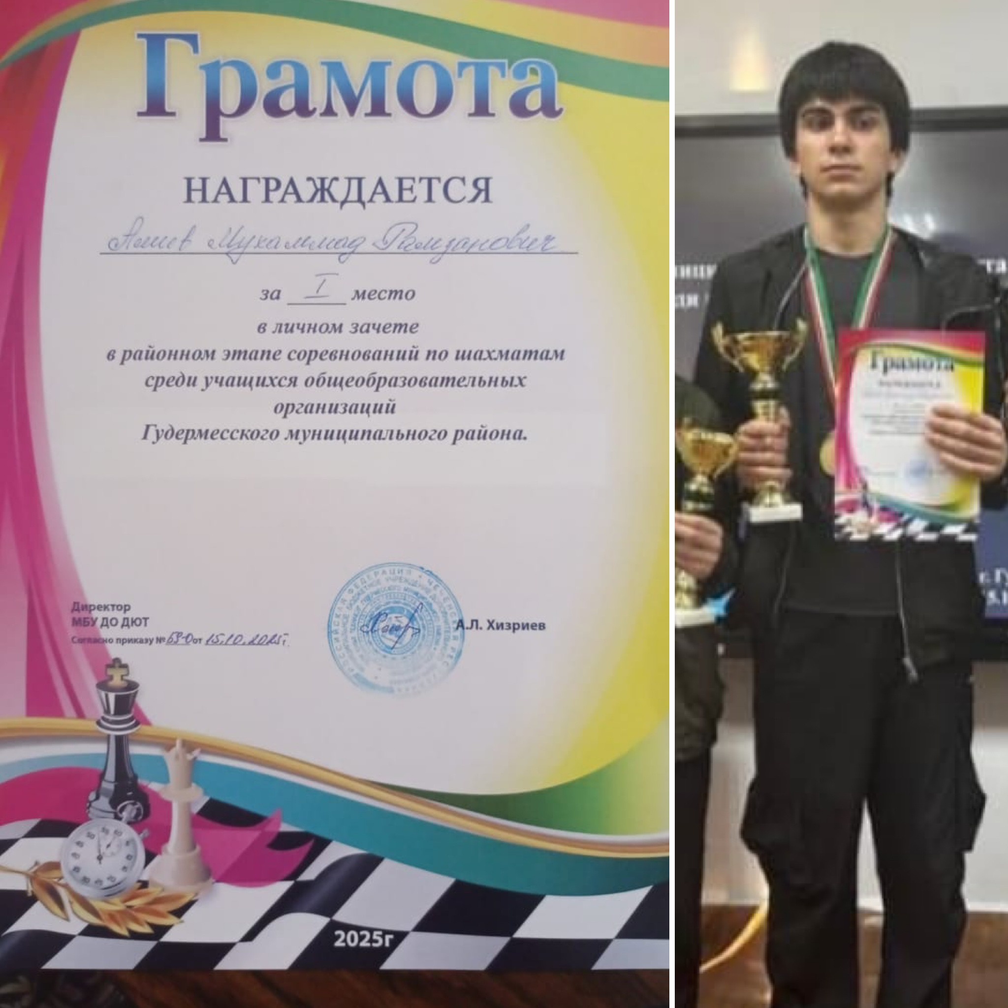 По итогам соревнований муниципального этапа Чемпионата ЧР по шахматам Алиев Мухаммад занял 1 место.