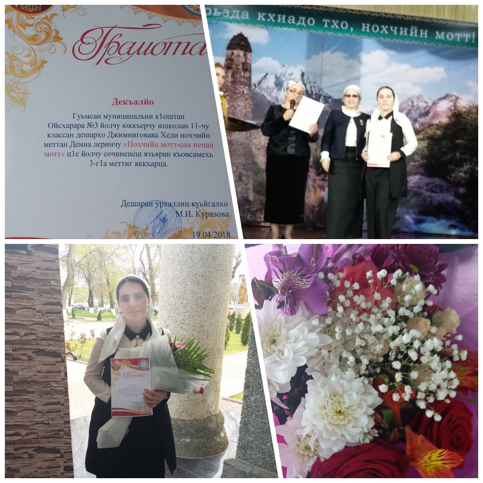 ДЕКЪАЛЙО!!! Гуьмсан муниципальни к1оштан Ойсхарара номер 3 йолчу ишколан дешархо Джимнигова Хеди нохчийн меттан Денна лерина "Нохчийн мотт - сан ненан мотт" ц1е йолчу сочиненеш язъяран къовсамехь 3г1а меттиг яккхарца.